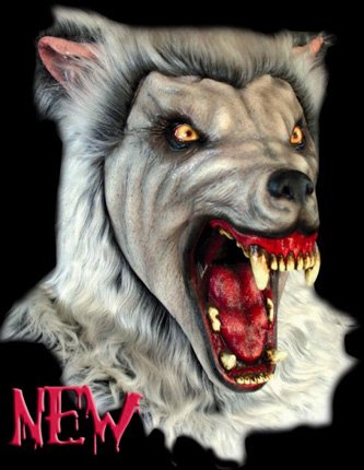 Snow Wolf Mask. Adult sized, one size fits most. This white werewolf mask features gray-white fur around the neck and head. The eyes are yellow and the muzzle is hairless and features an open mouth with large fangs. The deluxe style mask is perfect for a unique werewolf costume for Halloween.
