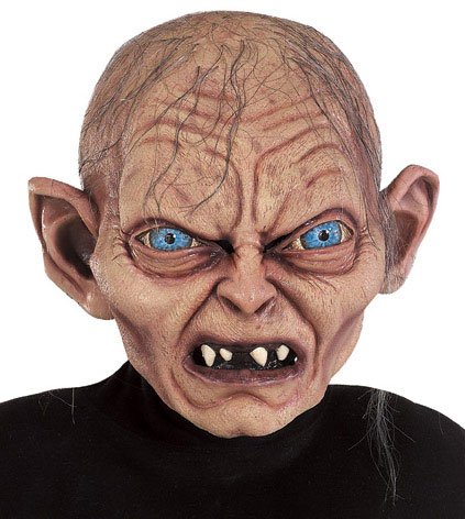 Gollum Costume Scary Mask - Authentic Lord of the Rings Costume Accessories - Scary Costume Accessories - This Gollum Mask has peach colored skin, blue eyes, cream colored teeth with some teeth missing, wrinkles on the forehead and some stray hair on the top. This Gollum Costume Mask is an officially licensed product. The Gollum Mask is sized as One Size Fits Most Adults.