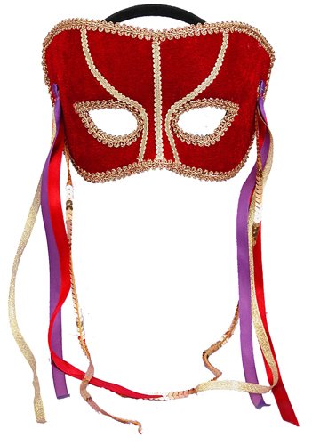 Elegant! Venetian couple mask features velvet covered plastic face mask, gold trim detailing and assorted colored hanging ribbons.
