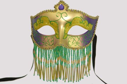 # This luxurious mask is made to be worn all night showing elegance and richness in a beautiful design# Masquerade Mask created with comfort and style in mind in the same style perfected by Venetian artisans over the last few centuries# Perfect for a Halloween, Masquerade, Mardi Gras, Prom or New Years Costume Party# With green tassels and glitter trim decoration# Glitter gold eye shade# Faux purple heart shaped diamond on middle topAlso available in other colors