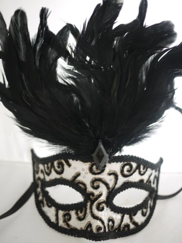 # This luxurious mask is made to be worn all night showing elegance and richness in a beautiful design# Perfect for a Halloween, Masquerade, Mardi Gras, Prom or New Years Costume Party# Elegant venetian style mask# Black fabric trim # White tiger stripe pattern with glitter decoration# Black diamond decor at front head # Black feather decoration# Features black feather and black comfort ribbonAlso available in other colors, please see our inventory.