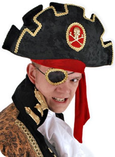 This replica hat is fashioned after the pirates of old, adorned with a metal skull and crossbones and a built-in red velvet sash. You will want to greet everyone you see with an 'ARR!' while wearing this scurvy ultra-suede bicorn hat. Avast!